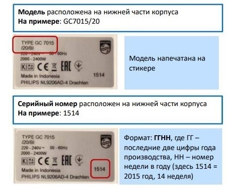 Номер модели начинается с GC, PSG, HI и 3,4 цифры. Пример номера модели: GC7015/20, GC7520/02. Название серии указано на утюжке. Пример названия серии: PerfectCare Viva, PerfectCare Elite Plus, PerfectCare Compact