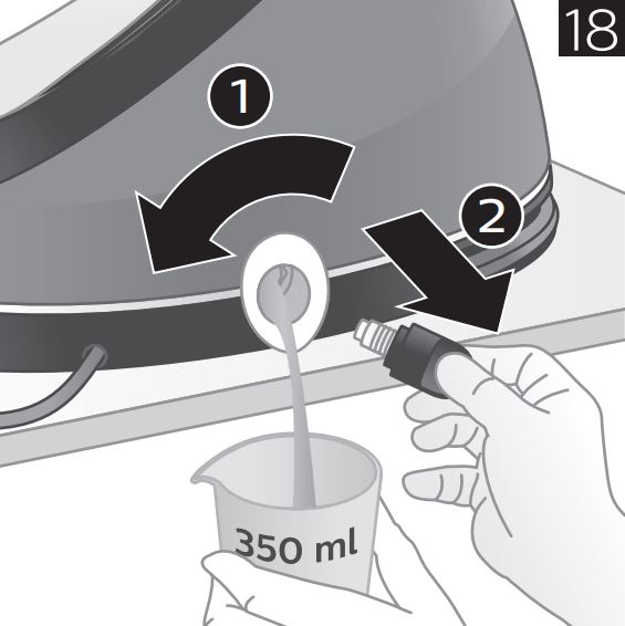 4. Под клапаном EASY DE-CALC поставьте емкость (не менее 350 мл) и поверните клапан против часовой стрелки. (Рис.18 - 1)