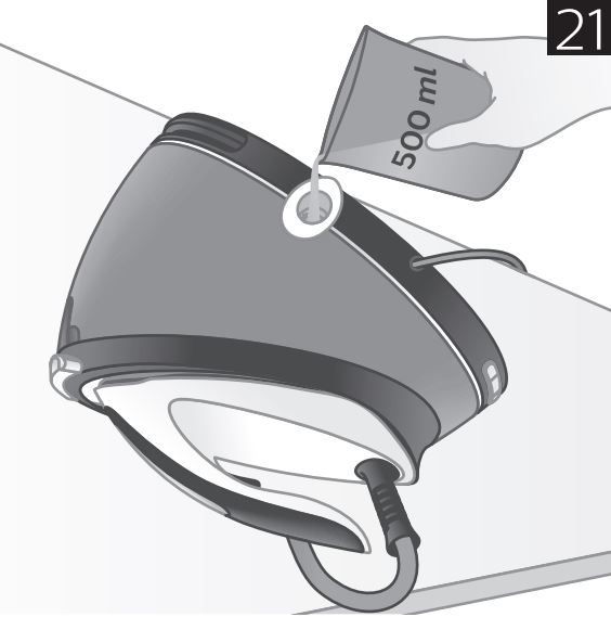 3. Наклоните прибор и извлеките клапан EASY DE-CALC. Налейте 500 мл дистиллированной воды через отверстие DE-CALC. (Рис.21)