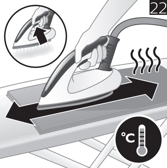 6. Удерживайте кнопку подачи пара нажатой, передвигая прибор по плотной ткани вперед и назад в течение 3 минут. (Рис. 22)
