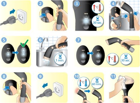 1. Подключите прибор к электросети и подождите 30 секунд, пока отпариватель для одежды нагревается. (рис. 1-3)